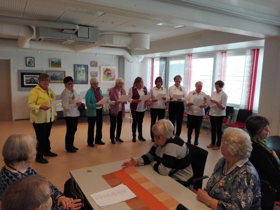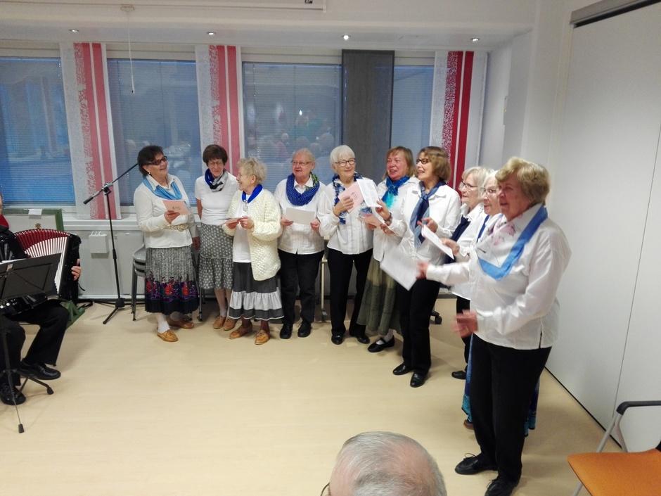 Naiskuoro tervehtii laululla teema päivän osallistujia Säestäjä Juhani Oravala on vähä piilossa