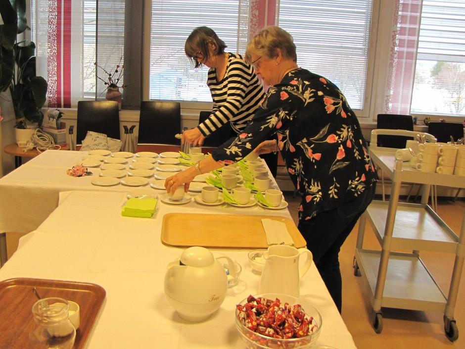 Äitienpäivä kahvit 8.5.2019 Tuula ja Laila kattaavat pöytää.