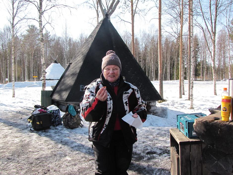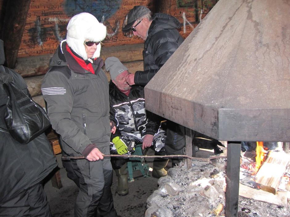Pilkkikilpailun jälkeen makkara maistuu Eskolan Railille. 3.4.2019