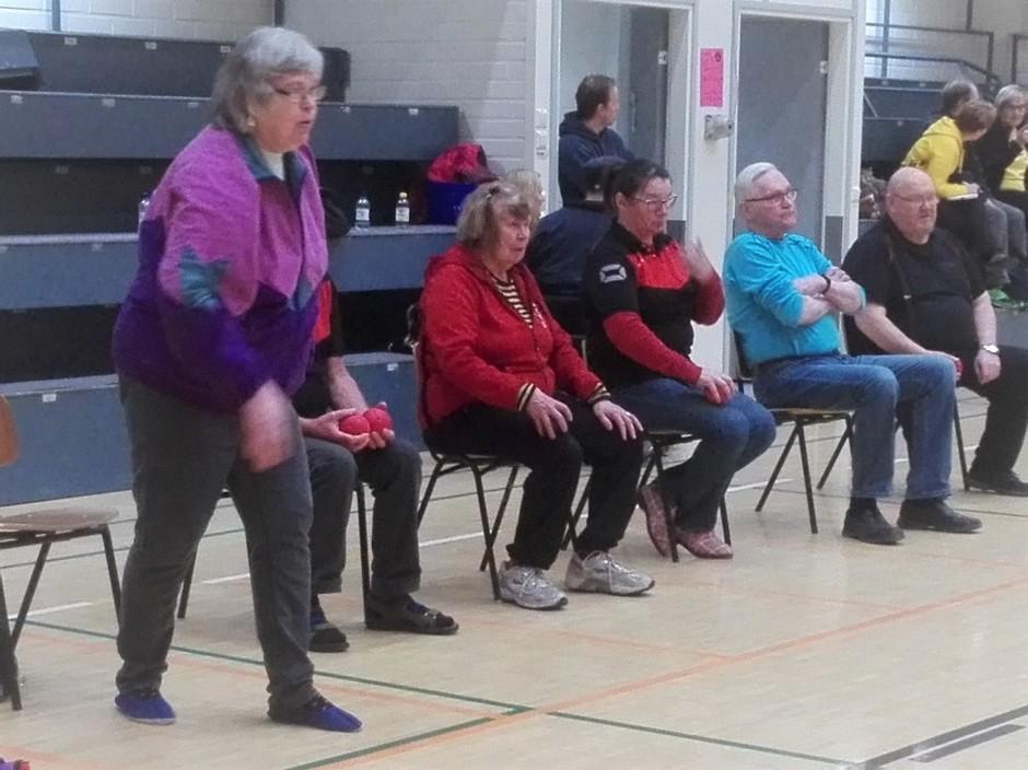 Boccia kilpailu 27.4, Leila heittää, Helena odottaa vuoroaa, Lasse (sininen paita) odottaa myös vuoroaa ja jännittää miten Leila heittää.