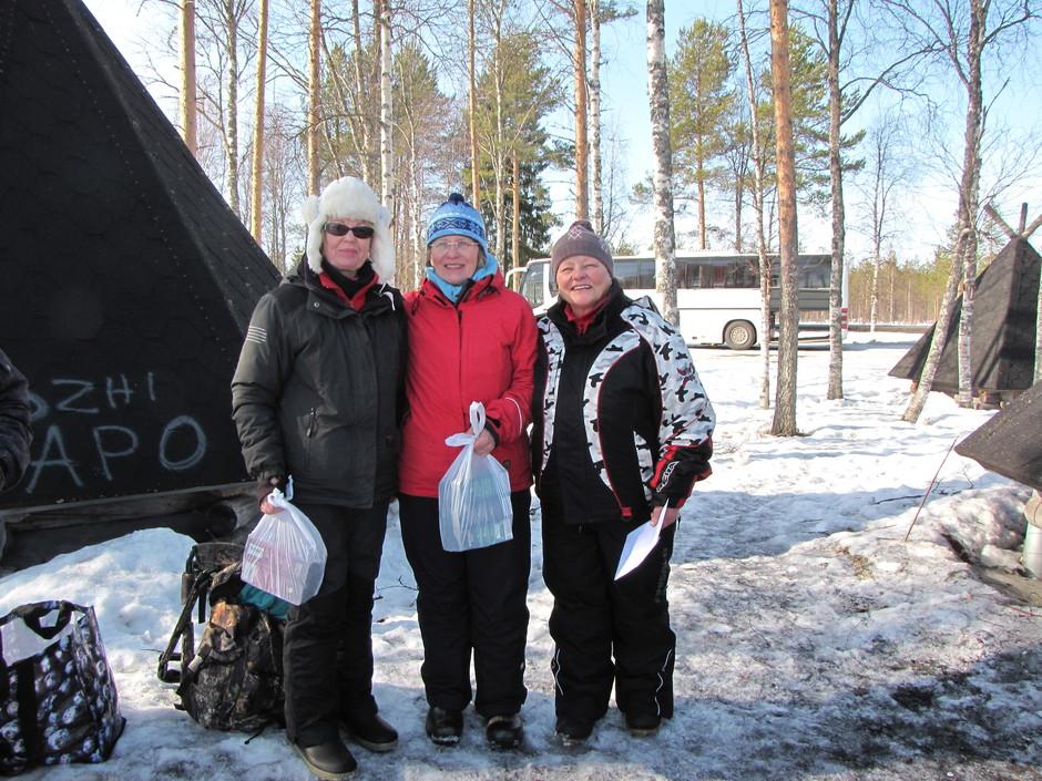 Naisten pilkkikilpailun palkitut, oikealta Laina voittaja, Aino toinen ja Raili kolmas. Raili sai arvonnasta myös verkon omakseen, Hiltusen Urpo oli lahjoittanut verkon arvontaan.