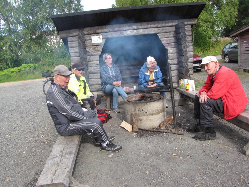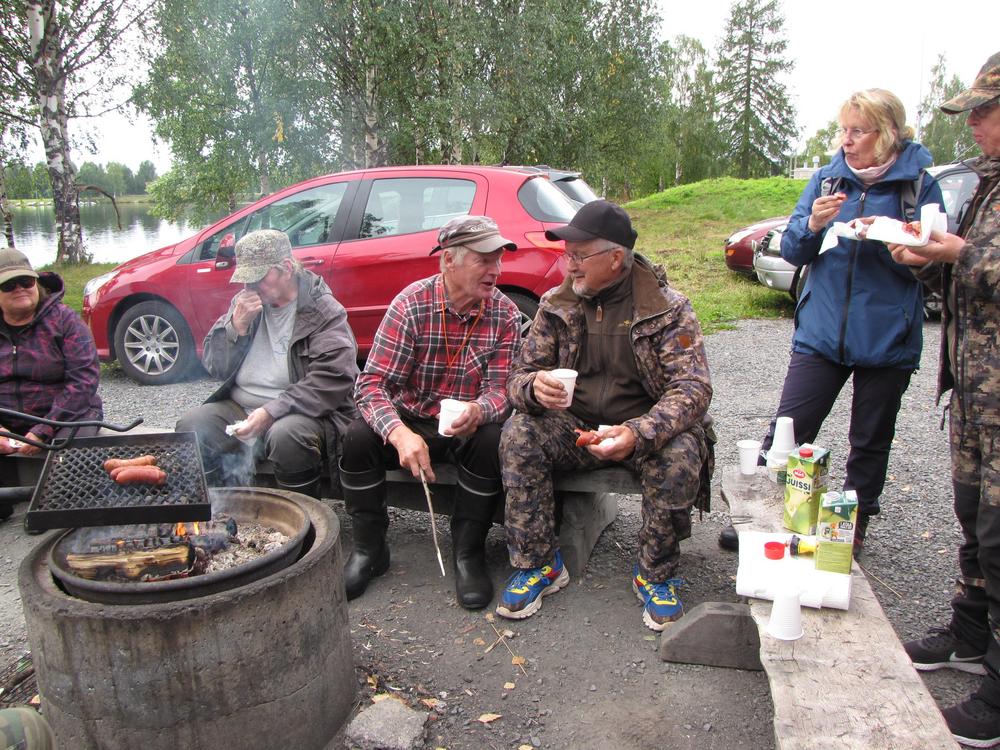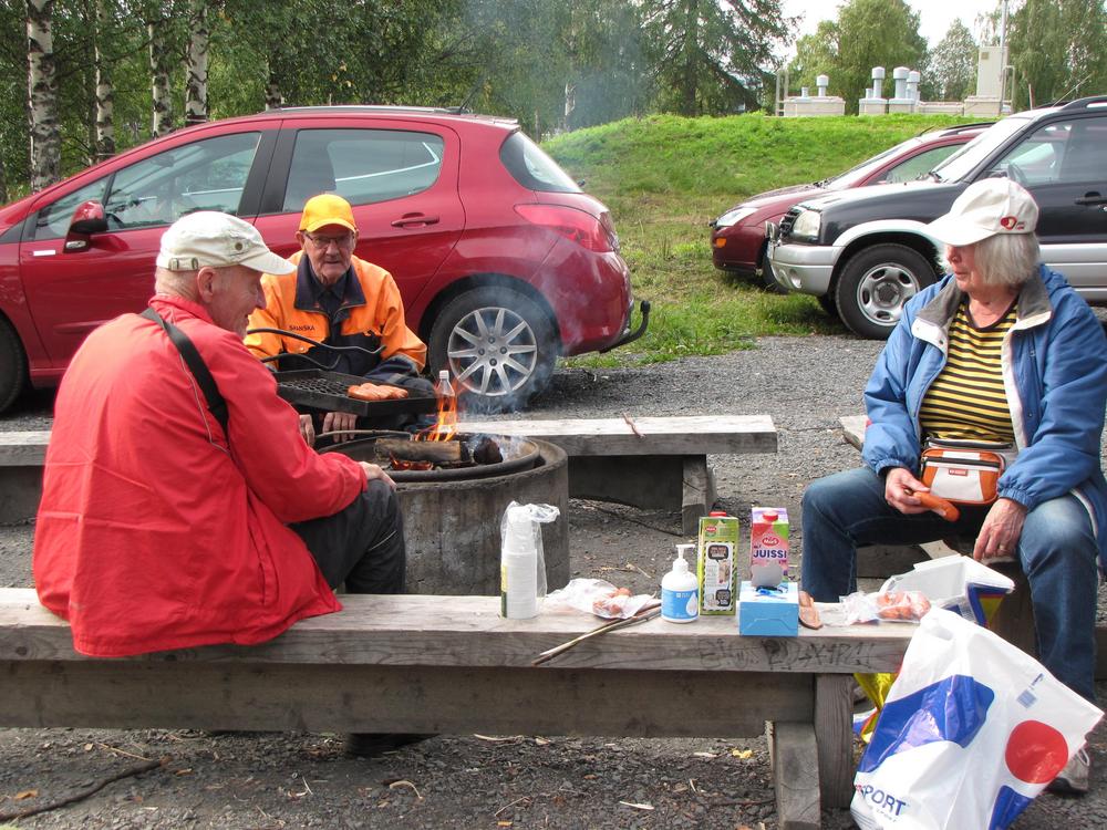 Juhani Latva, Raimo Luiro ja Helena Joro pitävät tulta yllä jotta makkarat paistuu.