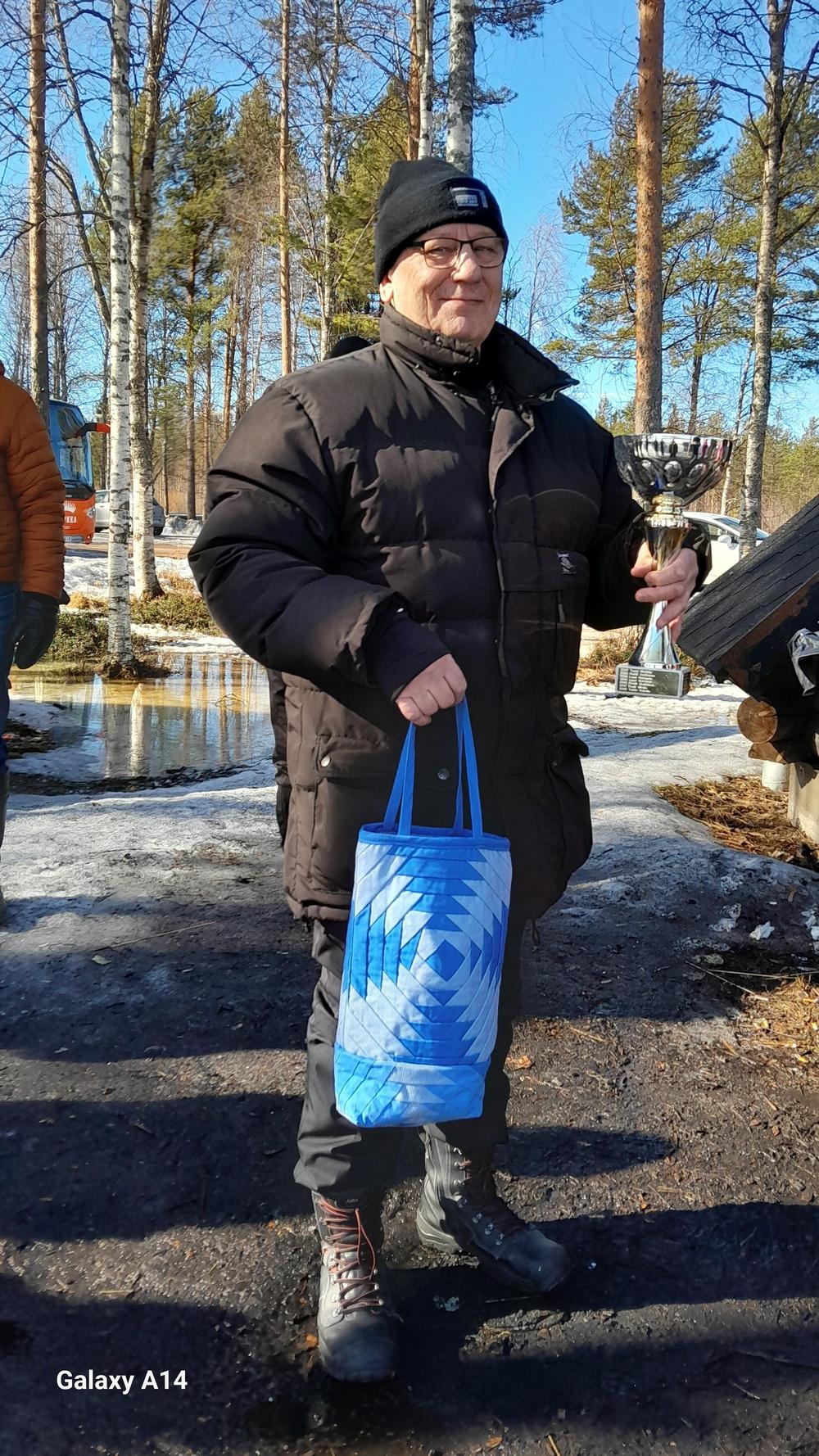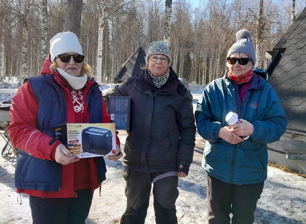 Piirin pilkkikisat 3.4.2025 Olkkajärvellä, vas. Aino toinen, Raili voitti ja HIlkka Heikkinen Kemijärvi kolmas.