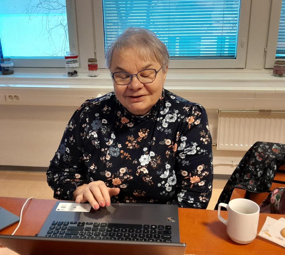 Pentti, Laina, Helena, Reijo ja Timo ryhmätyön parissa.
